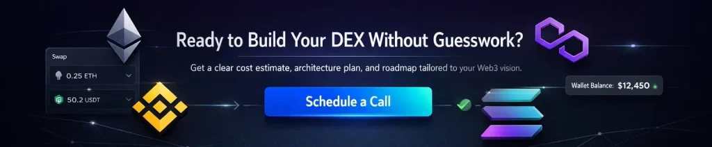 Hence, with the right way to create a DEX cost tier, it ensures long-term success. Businesses must balance budget, features, and scalability. Investing in secure, high-performance decentralized exchange solutions improves user trust. Also increases trading volume & competitive advantage in the crypto market.