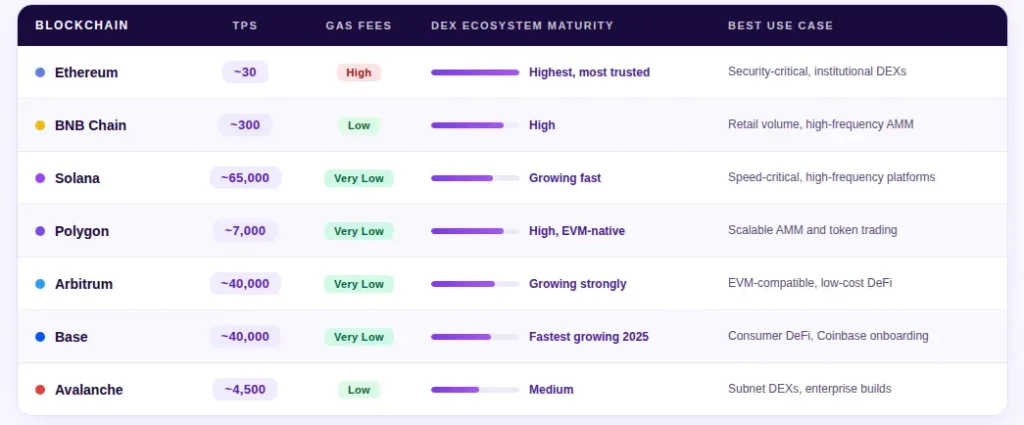 Ans: The right chain for DEX Development depends on your audience and goals. Ethereum is the gold standard for trust and liquidity depth. Polygon and Arbitrum offer EVM compatibility with much lower gas fees. Solana is ideal for high-frequency, speed-critical trading. BNB Chain attracts high retail volume, while Base is growing fast for consumer-focused DeFi.
