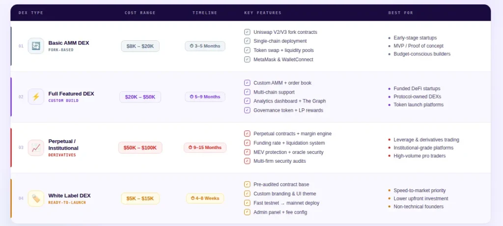 A white-label decentralized exchange solution architecture deployed on standardized pre-audited contracts and a uniform frontend can be created within 4 to 8 weeks at a fraction of the cost of a full custom implementation to founders who emphasize minimizing time-to-market and initial cost.