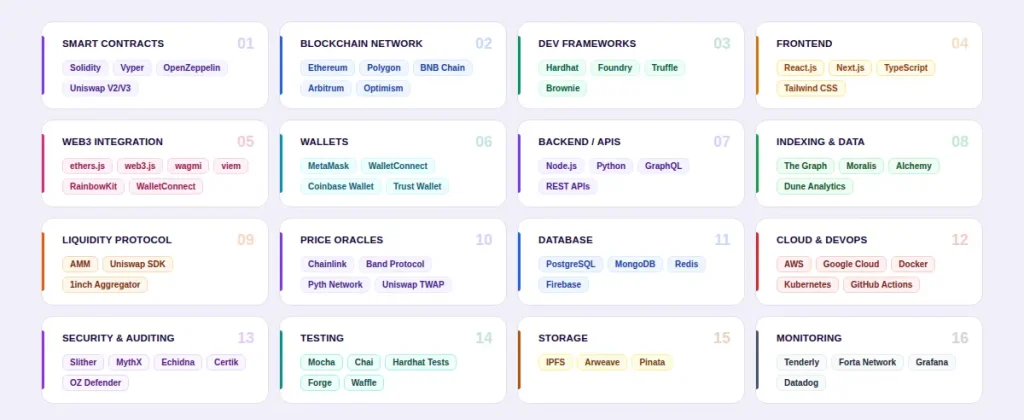 Ans: The core stack for DEX Development includes Solidity or Vyper for smart contracts, Hardhat or Foundry for development and testing, OpenZeppelin for audited contract libraries, ethers.js or wagmi for frontend Web3 integration, and The Graph for on-chain data indexing. Chainlink handles price feeds, MetaMask and WalletConnect manage wallet connections, and Slither or MythX cover security auditing before deployment.