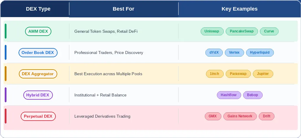 | Liquidity Source | Order book + market makers | Liquidity pools + AMMs |