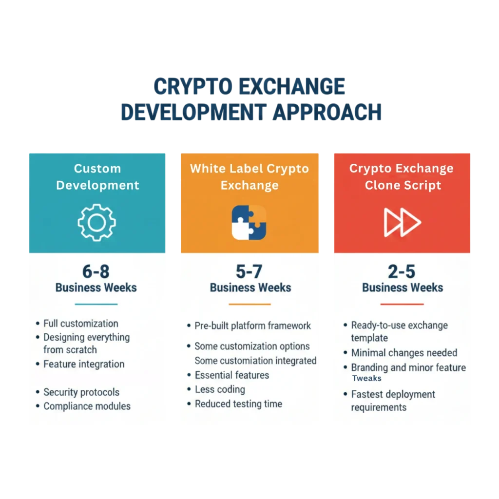 The time taken to launch a crypto exchange varies mainly due to the level of customization and the extensive support involved. Custom development takes the longest timeframe because every component, from UI/UX to trading engine, everything needs to be built and tested from scratch. While the White-label solutions save time by offering a pre-developed platform where businesses can customize modules without building the base structure. This reduces the development time to a few months. On the contrary, the crypto exchange clone scripts are the fastest route since they are ready-made replicas of proven exchanges. They require only minor branding and feature changes, allowing a functional platform to go live in just a few weeks.